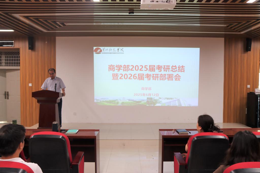 6月12日下午,商学部召开2025届考研总结暨2026届考研部署会。学部领导、各科教中心主任、公共外语教学部主任、专业负责人、全体升学导师、全体辅导员参加会议。会议由商学部执行部长张景忠主持。副部长孙常辉作商学部2025届考研工作总结。孙部长首先通报了商学部2025届录取情况,通过横向纵向数据对比,提出考研目标达成思路:抓好4年全学程规划指导,抓住英语基础、择校指导、复试调剂等10个关键环节,落实导师-辅导员沟通机制...