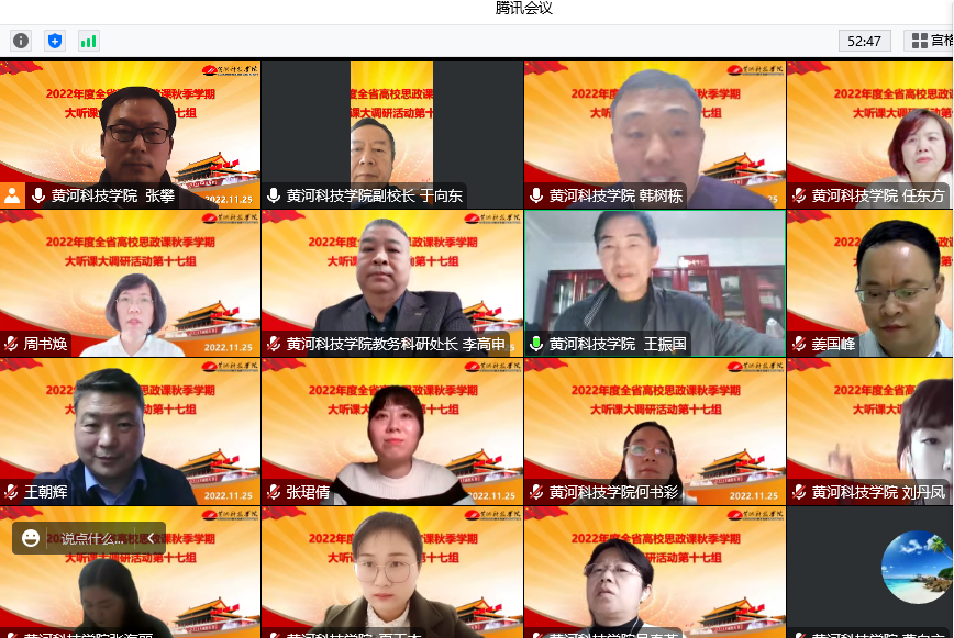 根据河南省委教育工委、河南省教育厅《关于开展2022年度全省高校思政课秋季学期“大听课”“大调研”活动的通知》安排,11月25日,由河南工程学院马克思主义学院院长姜国峰担任组长,河南警察学院马克思主义学院副院长王朝辉、河南工程学院马克思主义学院教授周书焕、河南财政金融学院马克思主义学院教授张珺倩为成员的第十七调研组采取线上会议形式召开beat365思政课建设座谈会。副校长于向东出席会议并致辞,校党委委员、宣传部...